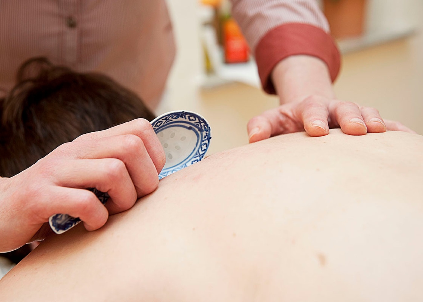 Für die Schröpfbehandlung werden Schröpfgläser auf die Haut gesetzt. Durch den dabei entstehenden Unterdruck wird die Durchblutung und der Lymphfluss des darunter liegenden Gewebes stark angeregt. Wenn die Haut zuvor mit Massageöl eingeölt wurde, können mit einem Schröpfglas Massagen durchgeführt werden. Hierfür ist besonders der obere Rücken, die Schulter- und Nackenregion geeignet. Durch die Reizwirkung der starken Durchblutung können flächige Blutergüsse entstehen, die als normales Behandlungsresultat gesehen werden und die nach wenigen Tagen wieder vollständig zurückgebildet werden. Es handelt sich hierbei um eine der effektivsten Methoden, um chronisch verspannte Muskulatur zu lockern. Beim so genannten Gua Sha wird ein ähnlicher Effekt erzielt: Die Haut wird eingeölt und mit einem Hornschaber oder einem Porzellanlöffel über mehrere Minuten ausgestrichen. Auch hier können sich Blutergüsse bilden, die Region wird stark durchblutet und durchwärmt. Sowohl die Schröpfmassage als auch das Gua Sha eignen sich zum Beispiel für die Behandlung folgender Beschwerden: